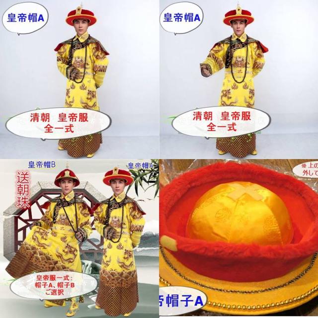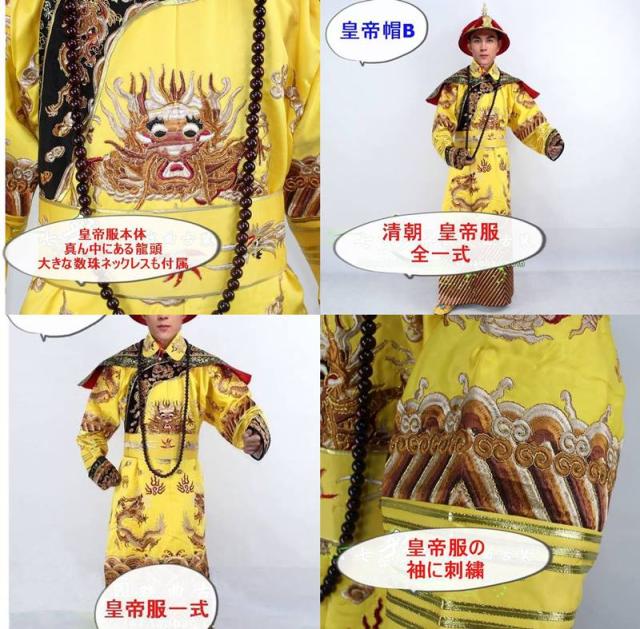 内容品:皇帝服本体(長袍、黄色ズボン)、皇帝帽子A(直径30cm)、辮髪110cm、龍靴25〜26cm、大判数珠ネックレス140cm