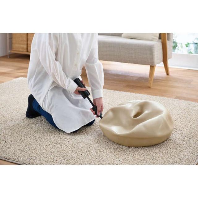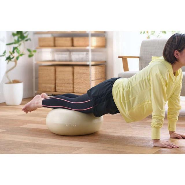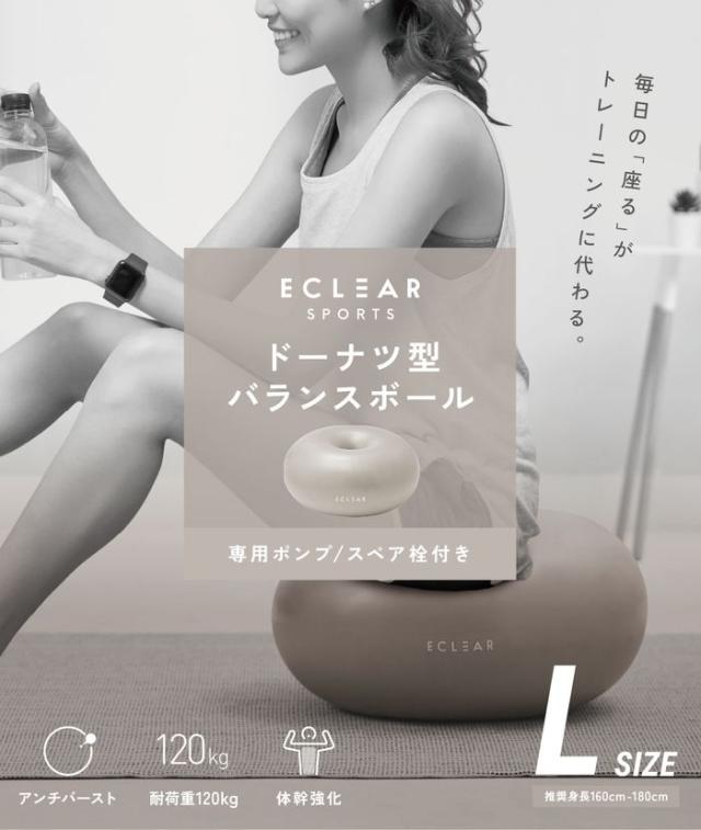 座るだけでいつでも体幹トレーニングができるエクリア スポーツ“ドーナツ型バランスボール”です。簡単なトレーニングから応用トレーニングやストレッチまで、幅広い運動ができます。ドーナツ形状で安定した座り心地です。破裂を防止するアンチバースト仕様です。転がらないので、部屋で邪魔になりません。部屋のインテリアに馴染むカラーリングを採用しています。耐荷重120kgの高耐久タイプです。空気を入れる専用ポンプ付きです。スペアの空気栓が付属しています。推奨身長約160〜180cmのLサイズです。