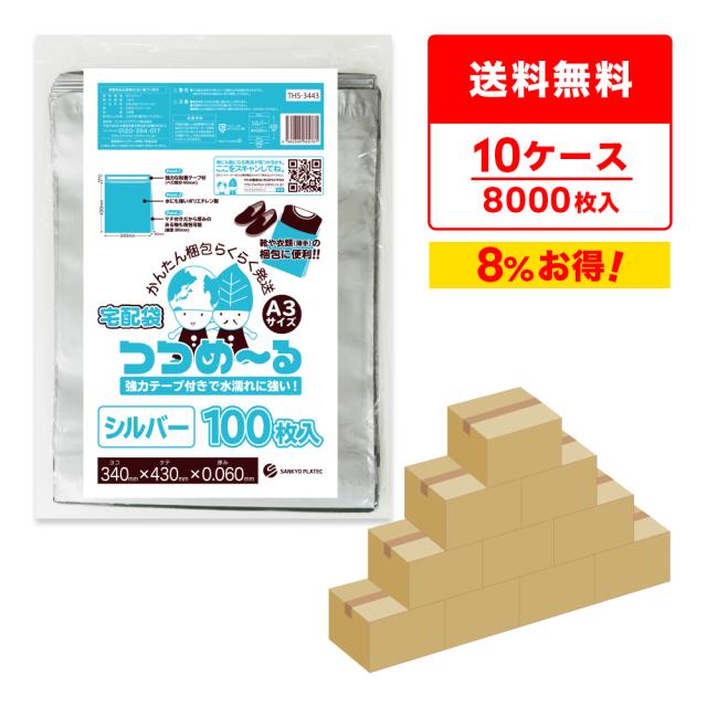 【まとめて10ケース】THS-3443-10 宅配袋 A3サイズ ヨコ340xタテ430(マチ付)+フタ40x0.060mm厚 シルバー 100枚x8冊x10箱 送料無料