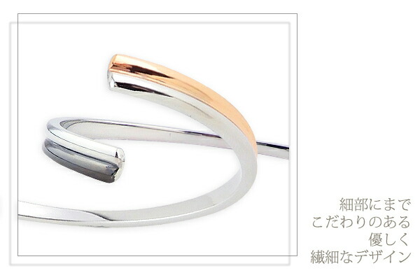 | コメント | 大人気のペアリングがバングルになりました!! 細身のバングルは、どんなコーディネートにも合わせやすく、つけているだけで手元が上品な印象に。シンプルなのにオシャレで他のアクセサリーや腕時計などの重ねづけにもピッタリ! 初めてのペアバングルとしてもおすすめで、性別や年齢を問わず、ちょっとしたプレゼントや記念日などの幅広いシーンでお使いいただけます。さらに、嬉しいケース付きです。 同じサイズや同じお色のペアの組み合わせもご選択いただけます。 医療用に使われているサージカルステンレスは肌に優しく金属アレルギーでアクセサリーをつけられない方にも安心です。 シルバーアクセサリーより軽くて丈夫で変色しにくい素材です。お手入れも、柔らかい布などでサッと拭くだけいいので、とってもカンタン。 ※お風呂や温泉などで変色しにくいですが、外していただく事をおススメしております。 |