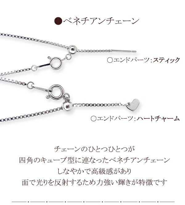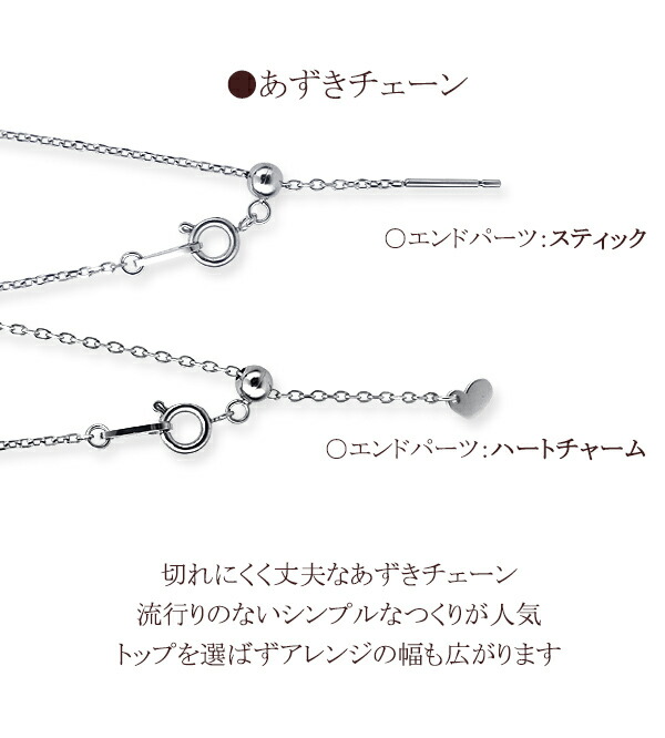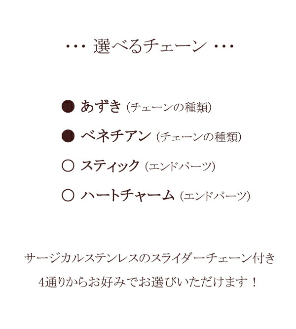 | コメント | スライダー式のステンレスチェーンはご自身でサイズ調整ができとても便利です。 あずきチェーンとベネチアンから選択可能 チェーンのエンドパーツはスティックとハートの選択ができます。 サージカルステンレス使用のアクセサリー。 医療用に使われているサージカルステンレスは肌に優しく、金属アレルギーでアクセサリーをつけられない方にも安心です。 シルバーアクセサリーより軽くて丈夫で変色しにくい素材ですのでお手入れ不要で海水や温泉につけても大丈夫です。 |