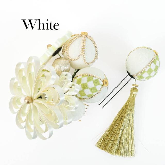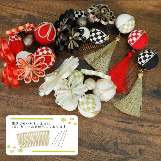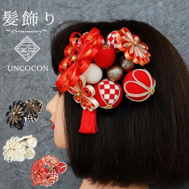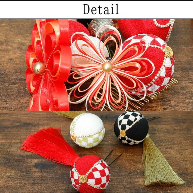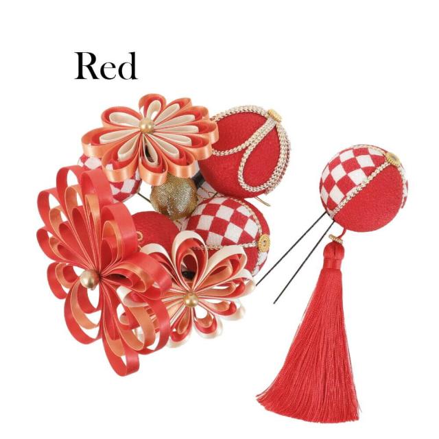髪飾り 成人式 2点セット 日本製 手作り レッド 白 毬 まり 花 ぶら飾り 赤 リボン コーム Uピン 卒業式 振袖
