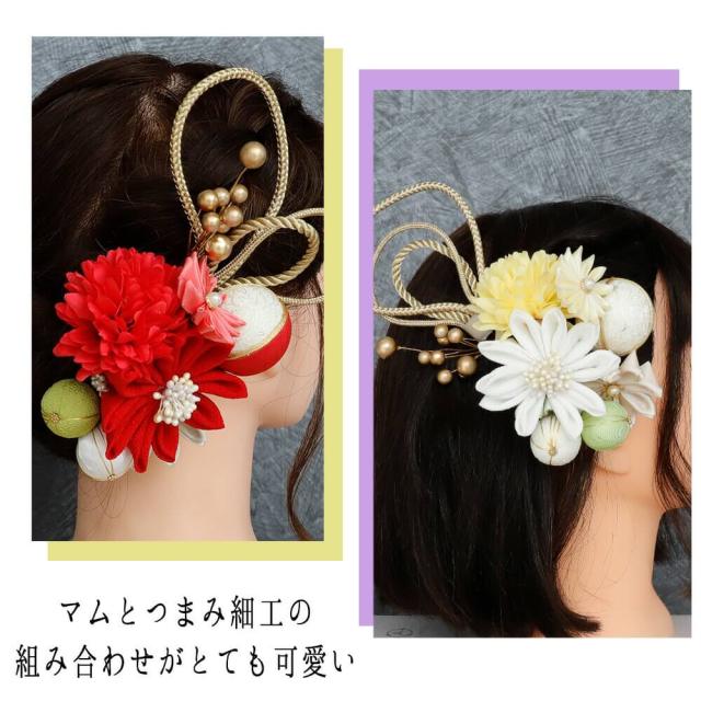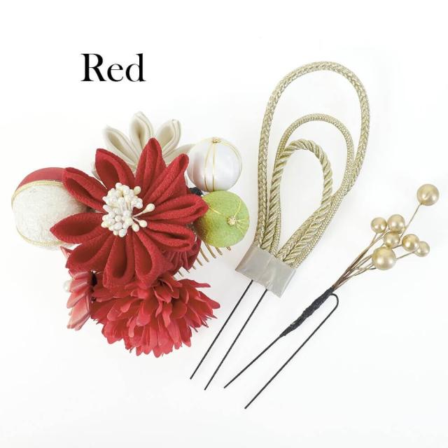 髪飾り 成人式 赤 つまみ細工 3点セット レッド 白 ピンポンマム 菊 花 ぶら飾り 組紐 コーム Uピン 卒業式 振袖