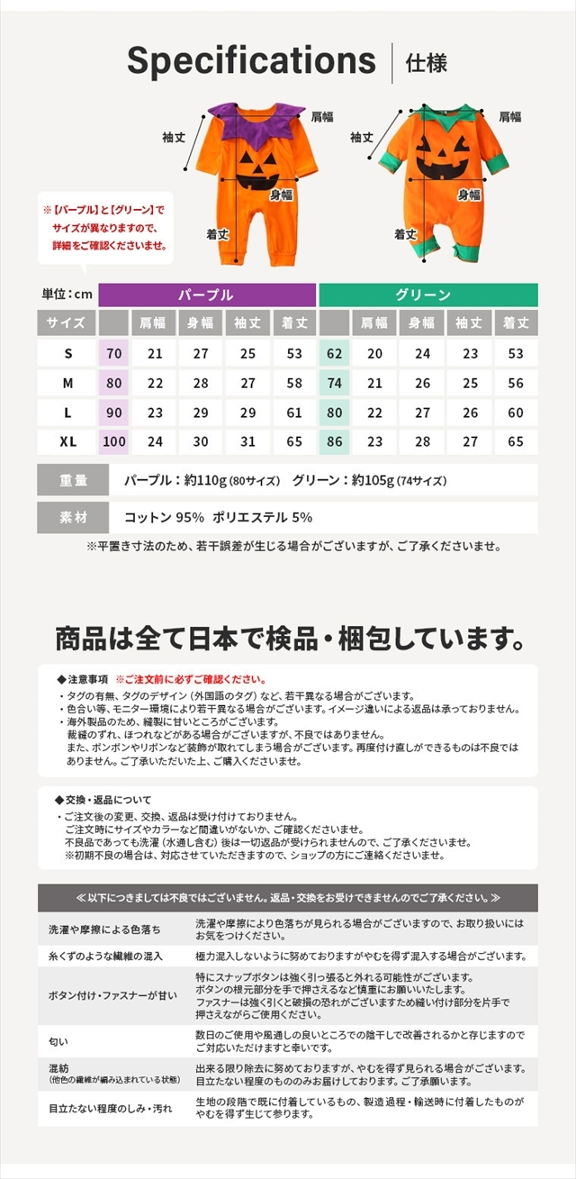 62 70 74 80 86 90 100 S M L XL オレンジ 紫 緑