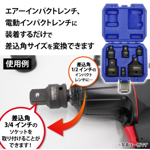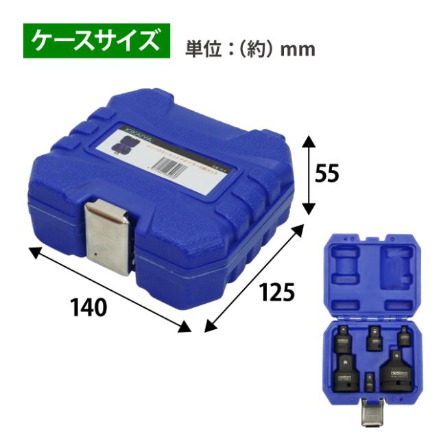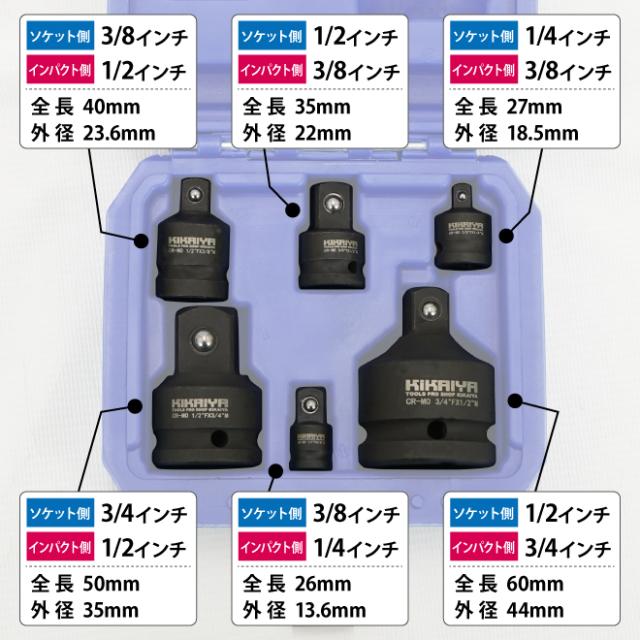 | セット内容 | ・<インパクト側>1/4インチ⇔<ソケット側>3/8インチ ・<インパクト側>3/8インチ⇔<ソケット側>1/4インチ ・<インパクト側>3/8インチ⇔<ソケット側>1/2インチ ・<インパクト側>1/2インチ⇔<ソケット側>3/8インチ ・<インパクト側>1/2インチ⇔<ソケット側>3/4インチ ・<インパクト側>3/4インチ⇔<ソケット側>1/2インチ ・専用ケース×1個 |