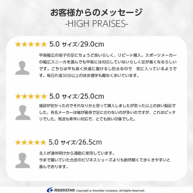 ムーンスターのメンズ防水スニーカーです。「4cm4時間防水」機能を搭載。幅広4E設計で、甲幅が広めな方にもおすすめです。ヒールの高さは4.0cmで、重量は26.0cmで片足約350gです。【ワイド設計】足幅の広い方に対応した商品です。【つま先ゆったり】つま先にゆとりをもたせた形状で、足の指を圧迫せずにのびのび動かせます。【通気カップインソール】通気性に優れた素材で靴内を快適に保ち、カップインソールの特性を併せ持ちます。【Ag+抗菌防臭】銀イオンの抗菌作用でにおいのもととなる菌の増殖を抑制し、防臭効果を発揮します。天然由来成分で安全です。【防水設計(4cm4時間防水)】地面から4cm、4時間の浸漬状態での防水性を備えた防水機能です。