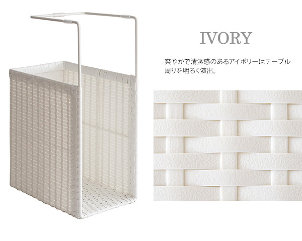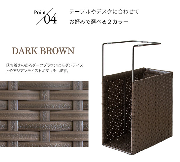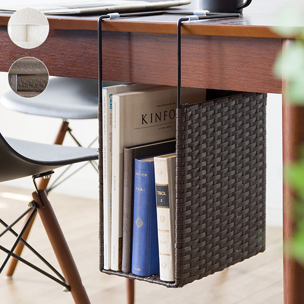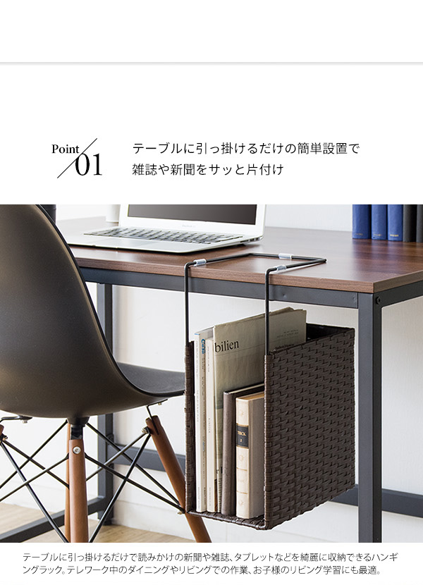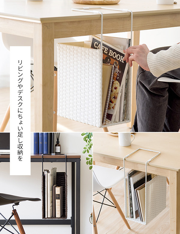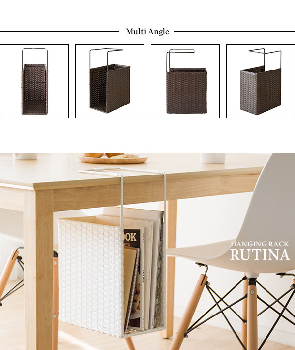 ダイニングテーブルやデスクに引っ掛けるだけで新聞や雑誌が収納できるポリエチレン製人工ラタンのハンギングラック『RUTINA(ルティーナ)』。 A4ファイルも入る高さで収納力バツグン。