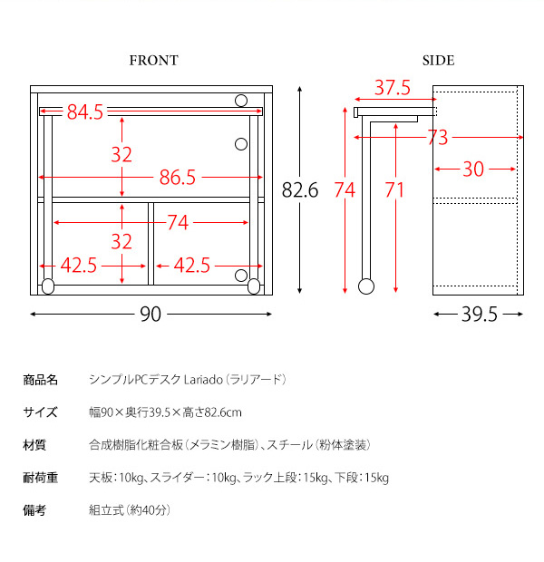 天板:10kg、スライダー:10kg、ラック上段:15kg、下段:15kg