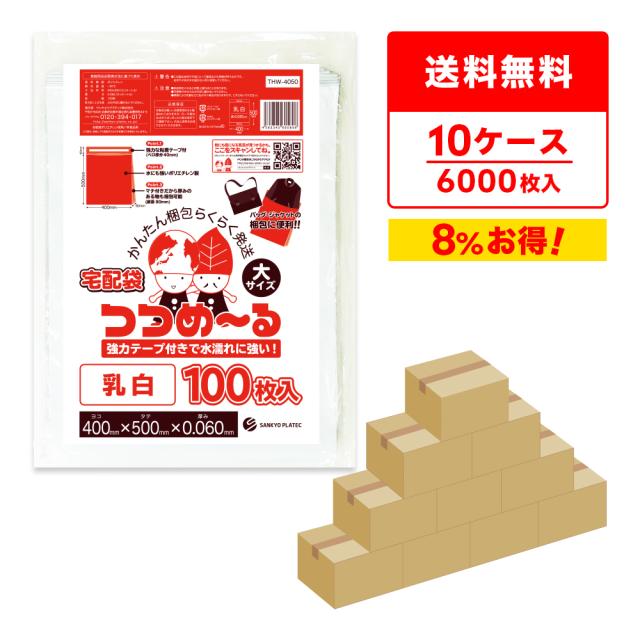 【まとめて10ケース】THW-4050-10 宅配袋 大サイズ ヨコ400xタテ500(マチ付)+フタ40x0.060mm厚 乳白 100枚x6冊x10箱 送料無料