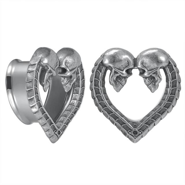 2匹のガイコツが不気味に存在感をアピールしてくれるハート型のフレアボディピアス。ステンレス製のハート型のダブルフレアなので装着の際は拡張器やインサーションテーパーがあると便利。