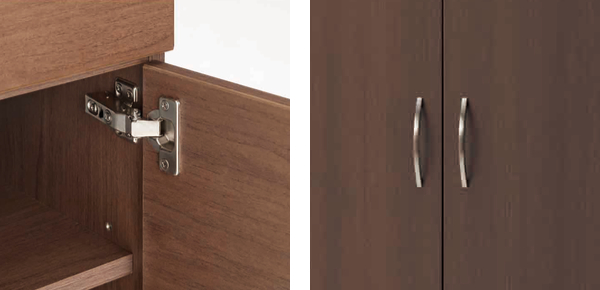 | ソフトクローズ扉で安全 扉を閉める際の衝撃をやわらげ、音も静かです。勢いよく閉まらないので、手を挟みにくく安心です。 | 開け閉めしやすい引き手 手が入れやすく、開け閉めのしやすい引き手です。木目調の本体に良いアクセントとなっています。 |