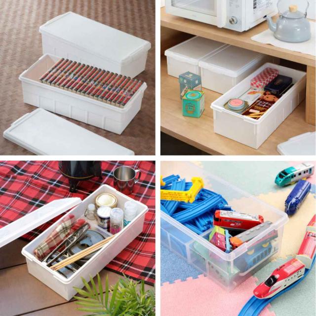 本だけでなく、子供のおもちゃやキッチン収納、アウトドアの収納ボックスとしてもお使いいただけます。長い物もすっぽり入るので調理器具やパスタなどのストック収納にも最適です。