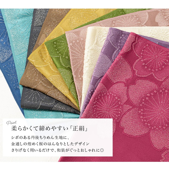 シボのある丹後ちりめん生地に、金通しの煌めく桜がはんなりとしたデザインです。