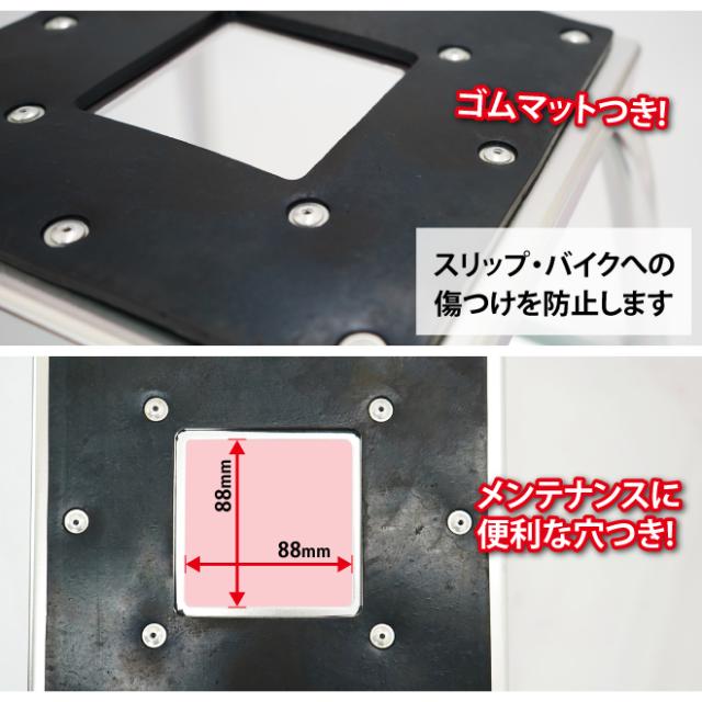 ツーリング先でのメンテナンスもおまかせ! ●オフロードバイクなど車両重量450kgまでのバイクに対応したバイクスタンドです ●車両の整備、洗車、展示など様々な用途でお使いいただけます ●天板にはゴムマットが付いており、スリップやバイクへの傷つけを防止します ●天板中央にはメンテナンスホールがあります ●スタンド部分が広く、安定しています ●アルミ製の軽量&コンパクトな設計なので持ち運びに便利です ●車に積んで持ち運びができるので、ツーリング先でのメンテナンスにもお使い いただけます ※必ず水平な場所で使用してください ※バイクを天板に乗せる際は安全のため二人以上で作業されることを推奨します |