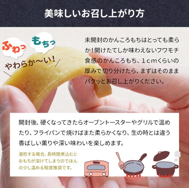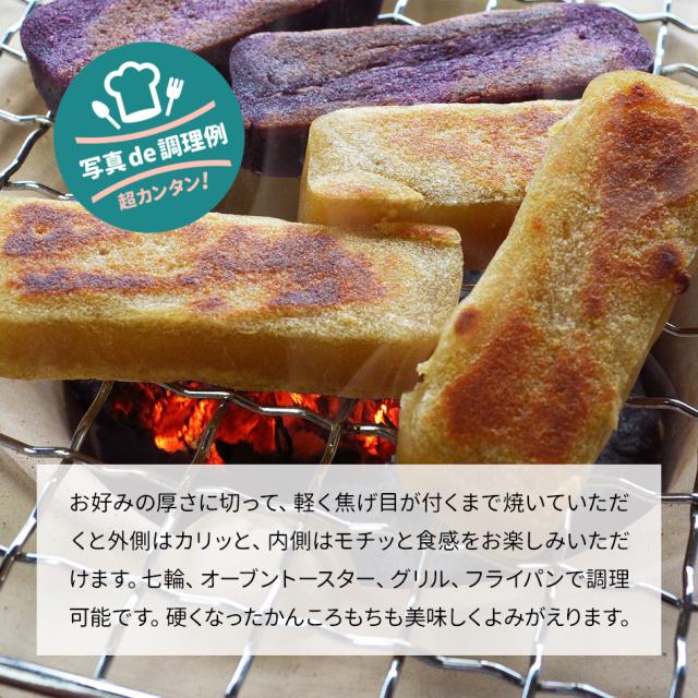| 調理方法 | 柔らかい内は調理不要で、そのままお召し上がりいただけます。開封後に硬くなってきたら、オーブンレンジやフライパン等で温めてお召し上がりください。衣を付けて天ぷら風に揚げると一風変わった風味で楽しめます。その他あんこ、きなこ、バター等で調味しても楽しいので、いろいろアレンジしてみてください。 本品は切れ目が入っておりませんので、お召し上がりの際は包丁等で1〜2cm程度の厚みに切り分ける必要があります。 |