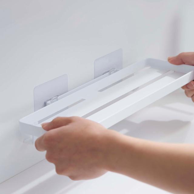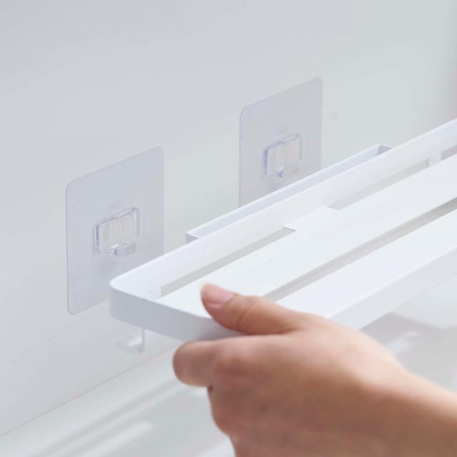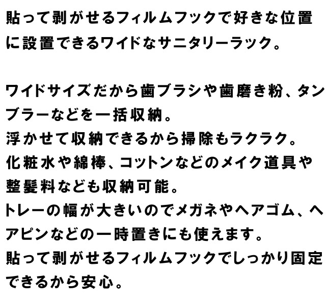 貼って剥がせるフィルムフックで好きな位置に設置できるワイドなサニタリーラック。