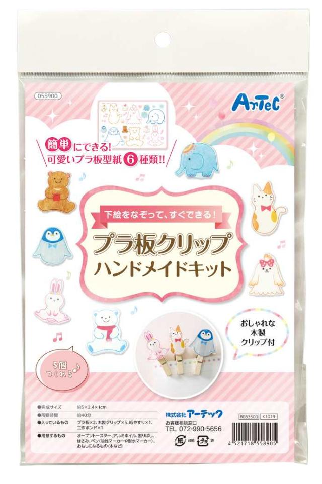 セット内容:プラ板(サイズ:B6、厚み:0.35mm)×2、木製クリップ×5、紙やすり(115×9mm)×1、工作ボンド×1、プラ板型紙(説明書裏面)×1