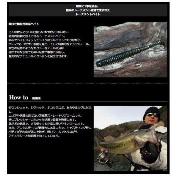 | | 競技仕様型万能系ベイト どんな状況でも1本を獲らなければならない時に、 絶対的信頼で投入できるトーナメントベイト。 細みでベイトフィッシュライクなシルエットでありながら、 ボディのリブが太い波動を発生。そして特徴的なアンクルテール。 女性の足首のようなセクシーなテール部分は 極わずかな水流でも細い足首が敏感に反応し、 魅力的なナチュラルアクションを発生させます。 ダウンショット、ジグヘッド、ネコリグなど、あらゆるリグに対応し、 エリアや状況も選ばない万能系ストレートリブワームです。 特にプレッシャーのかかった状況で真価を発揮します。 誰がどの状況で、どう使っても非常に使いやすいワームです。 また、アンクルテールが最後方にあることで、キャスティング時に ボディが折れ曲がるのを防ぎ、軽いワームでありながら アキュラシーと飛距離を向上しています。 |