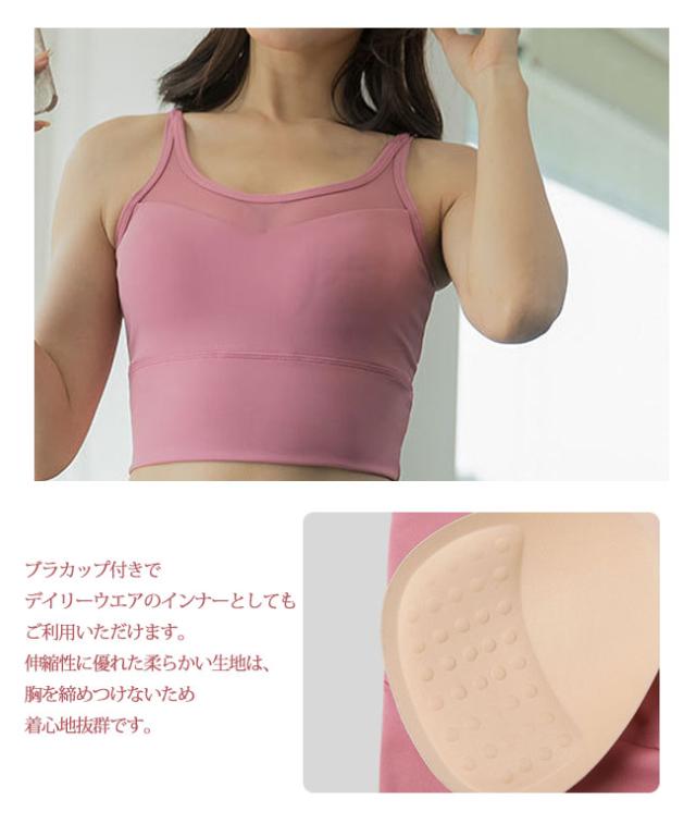 柔らかくて伸縮性のある素材で着心地抜群のブラトップ。 柔らかな素材なのにサポート感がありつけ心地もよく運動しやすかったです。伸縮性が高くぴったりとフィット。ランニングの時も揺れを防いで、しっかりサポート肌に優しいノンワイヤーブラです。伸縮性に優れた柔らかい生地は、胸を締めつけないため着心地抜群です。運動時にバストが揺れない!蒸れない!動かない!から快適なスポーツライフを。さらりとした質感の気持ちいい着心地! 汗によるベタつきを軽減します。機能性・伸縮性・吸水性も抜群で、ヨガだけに限らずランやフィットネスにもおすすめの優秀アイテムです。ブラカップ付きでデイリーウエアのインナーとしてもご利用いただけます。