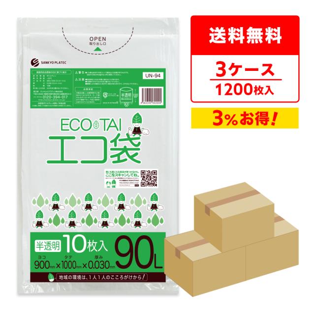【まとめて3ケース】UN-94-3 ポリ袋 90リットル 0.030mm厚 半透明 10枚x40冊x3箱 / ゴミ袋 ごみ袋 送料無料