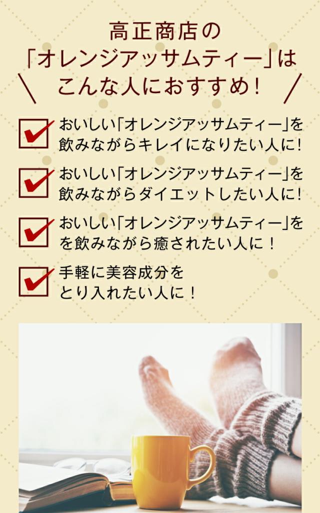 甘いものは食べたいけど、カロリーが気になる...美味しいものってだいたい太るし...と思われるかもしれませんが高正商店のオレンジーアッサムティーは1杯当たり、なんと80キロカロリー未満!果物の実まで丸ごと食べられるアッサムティーなので、満足感が高く、おやつ無しで満たされます♪これなら自然にダイエットできちゃうかも♡