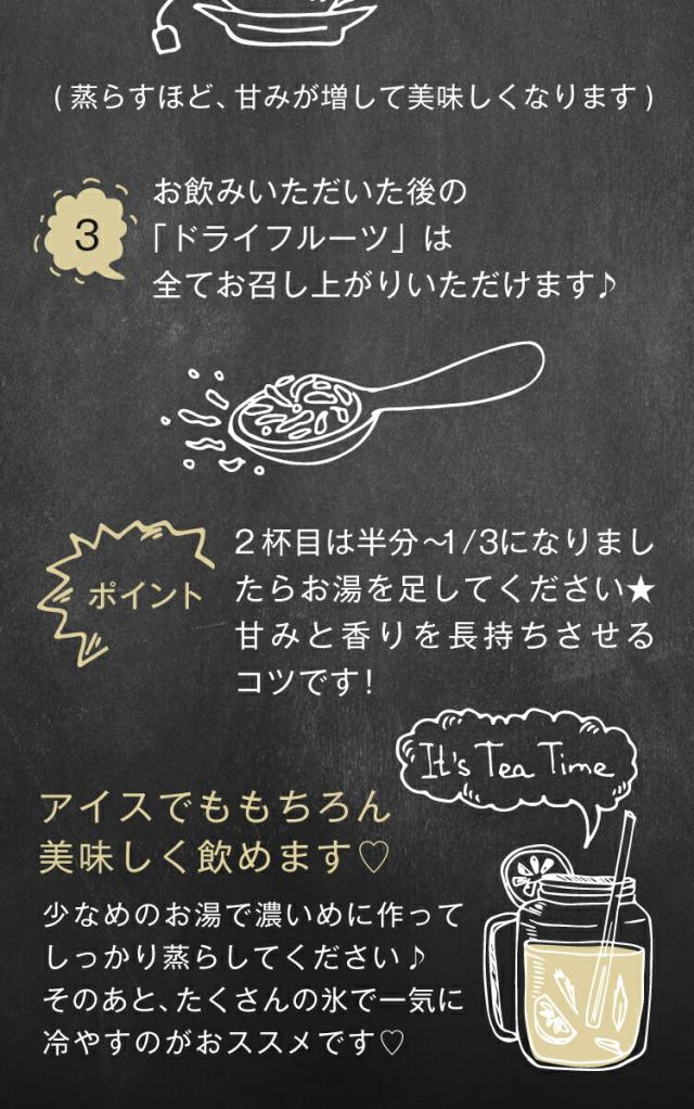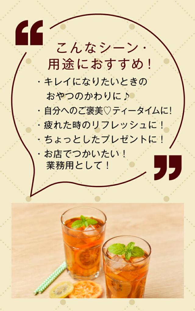 フレーバーだけではなく、オレンジやみかんなどまるごと入っていますので、フルーツに含まれるビタミンCやアミノ酸などの美容成分が丸ごと食べられちゃいます♪また、柑橘系の爽やかな自然の甘みがプラスされて飲みやすくなっているので、コーヒーや紅茶が苦手な方にもおススメです!