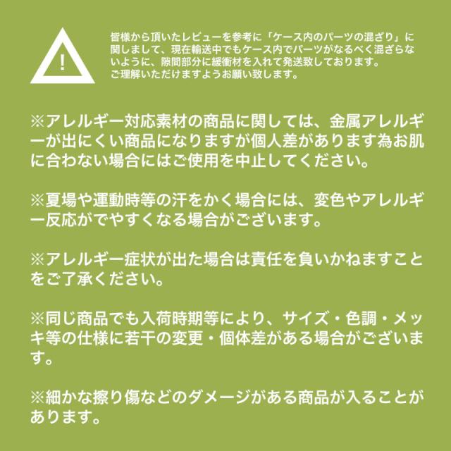 ※アレルギー対応素材の商品に関しては、金属アレルギーが出にくい商品になりますが、個人差があります為お肌に合わない場合にはご使用を中止してください。
