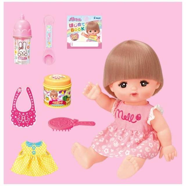 ショートヘアメルちゃん本体(おむつ付)、ワンピース2着、ベビーフード、スプーン、ミルクびん、スタイ、ブラシ、ミニブック