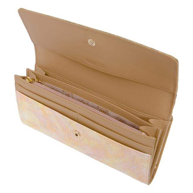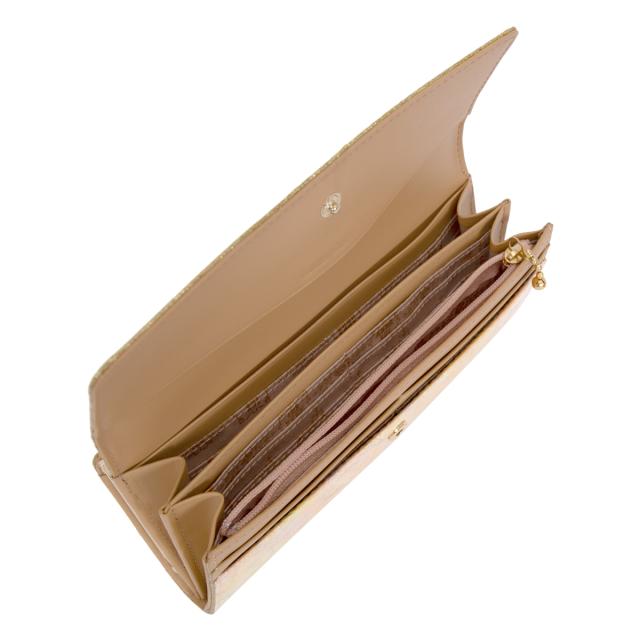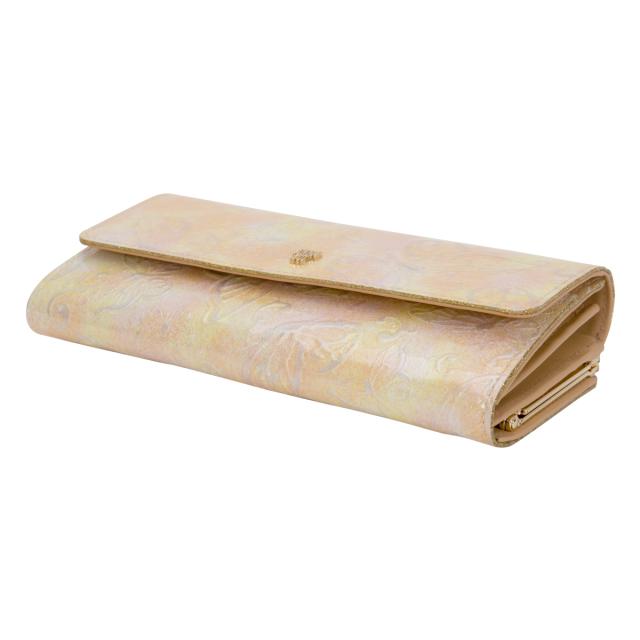 儚げな蝶のモチーフが優しい雰囲気を醸し出すがま口付きロングウォレット。エナメル加工の牛革製。多色の柔らかな色合いのプリント柄に、エンボスを施し細かいラメを手作業で吹き付けたこだわり仕様。ワイドに開いて取り出しやすく、充実の収納で機能的です。
