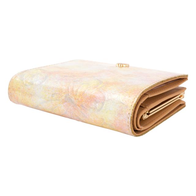 儚げな蝶のモチーフが優しい雰囲気を醸し出す二つ折りウォレット。エナメル加工の牛革製。多色の柔らかな色合いのプリント柄に、エンボスを施し細かいラメを手作業で吹き付けたこだわり仕様。独立したがま口型の小銭入れと十分なカード収納で機能性も抜群です。