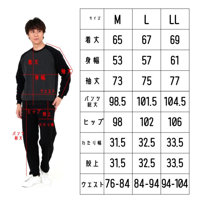 (LL)着丈 約69cm 身幅 約61cm 袖丈(首から) 約77cm パンツ総丈 約104.5cm ヒップ 約106cm わたり幅 約33.5cm 股上 約33.5cm ウエスト 約94〜104cm