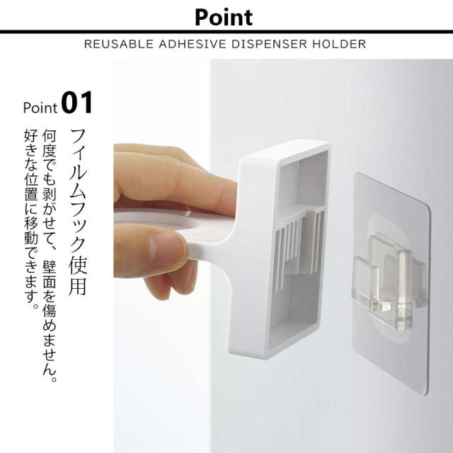 ネジを使わない『フィルムフック』で好きな位置に設置できるディスペンサーホルダー浴室のタイル面・洗面壁面・キッチンシンク壁面などにフィルムフックで簡単取り付け。
