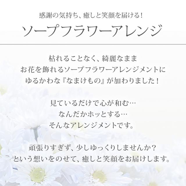| 商品説明 | ソープフラワーは石鹸で作られているお花、本物のお花と見間違えるほどリアルに作られていて、お値段の割に豪華です。お手入れ不要でアロマが香る、そして華やかで長持ちと、近年人気上昇中のギフトです。 ゆるくて可愛いナマケモノの器にもアレンジされたソープフラワーアレンジメントは、見ているだけで癒される可愛さ! ほんのりと石鹸の香で、お部屋が癒しの空間に! 吊り下げてもかざれるヒモがついているので、壁掛けにして空間を利用することも可能です! コンパクトサイズで、置く場所にも困らないので、玄関やリビングなど、お好みの場所に飾っていただけます! (※)石鹸で出来ていても汚れを落とすことを目的としたものではございません。観賞用としてのご利用になります。 |