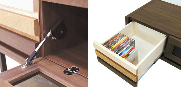 | スムーズな開閉 ゆっくり開くソフトダウンステーは開閉時の衝撃を和らげ、お子様のいるご家庭でも安心です。 | 引出し収納 CDやDVDを収納するのに最適なサイズで、テレビ周りの小物類をすっきり収納できます。 |