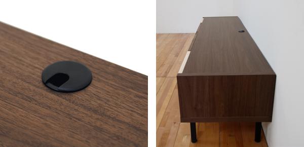 | 天板と収納内部に配線キャップ 天板とデッキ収納内部には配線収納に便利な配線キャップが付いています。背面を壁と隙間なく置いても配線の出し入れができ、とても便利です。 | 幅木をよけて設置可能 脚部が4cm内側に入っているので、壁の幅木をよけてテレビボード本体をピッタリと設置することができます。 |