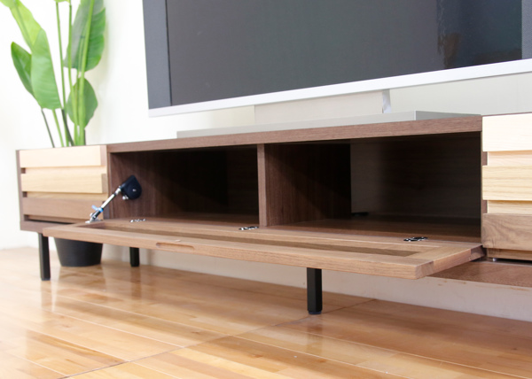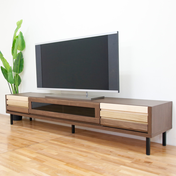 ウォールナットをベースに、ホワイトオーク材・メープル材を組み合わせて作ったオシャレでかわいいテレビボードです。幅は約200cmで大型テレビも十分置けるサイズです。表面材には天然木を使用しているので高級感があります。