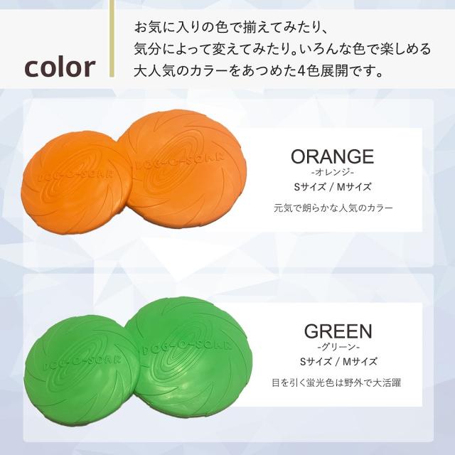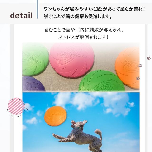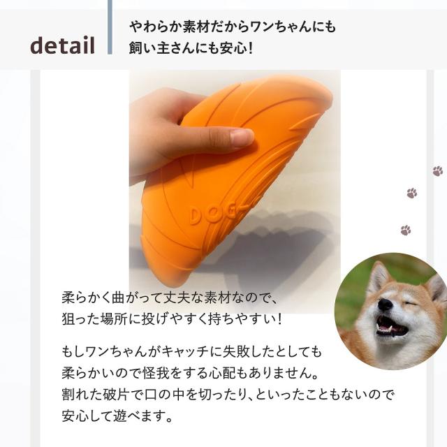 - 布のフリスビーでは破れ易く、プラだと硬すぎるようで、シリコンは丁度いい噛み心地のようです。手頃な値段で使い心地を試すにもピッタリです。
