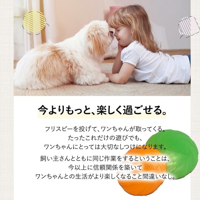| 商品の説明 | 思い切り投げて、思いっきり走る。 ストレスを解消して楽しく遊べる、いま選ばれている大人気の柔らかフリスビーです。 はっきりとしたビビッドカラーは、野外での遊びに最適。 おもわずワンちゃんが追いかけたくなるフォルムで たまったストレスを解消し、運動不足のワンちゃんだけでなく 「最近太ってきたかも…」と悩んでいる飼い主さんのお悩みも解決に導いてくれます。 まるごと水洗いができる素材なので、汚れたら水道でさっと洗っていつでも清潔に。 遊んだあとの公園で水分を補給させるためのトレーとしてもつかえるので、 荷物を減らしてスムーズなお散歩ができます。 柔らかくって丸みのあるデザインは、ワンちゃんの歯を痛める心配がありません。 いつまでも健康にいてほしい愛犬と、楽しくストレスのない生活を。 愛犬家のお友達やご家族への贈り物としても最適です! |