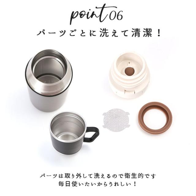 | 注意点 | [M/BLACK]のカラーのみ、「コップ+本体:マット仕上げ」。他のカラーは「コップ:マット仕上げ、本体:ミラー仕上げになります。 ※乳幼児の手の届くところに置かないでください。また、いたずらには十分に注意してください。 ※本製品は飲み物専用です。本来の目的以外の使用はしないでください。 ※本体の口元(口金)に熱いやかん等をあてないでください。変形の原因、または転倒してやけどやケガの原因となるおそれがあります。 ※バッグの中身などで開閉ボタンが押されないように注意してください。やけどやケガ・ものを汚す原因となります。 ※フタを開けた状態で、栓ユニットを外さないでください。変形・破損、やけどの原因となります。 ※熱い飲み物を入れた場合は、注意してお飲みください。急に傾けると中の液体が勢いよく飛び出てやけどやケガの原因となります。断熱効果により、熱い飲み物を入れても本体の外側は熱くなりません。(コップは断熱されてないので、熱い飲み物を入れた際にはステンレスの部分を触らないよう注意してください。) ※フタや栓ユニットを開けたまま長時間放置しないでください。転倒して中身がこぼれ、やけどやものを汚す原因になります。 ※持ち運ぶ際は、栓が確実に閉まっている事を確認してください。閉め方が不充分だと、中の液体がもれ、やけどやケガ・衣類やバッグ、敷物などを汚す原因となります。 ※自動車走行中には使用しないでください。中の液体がもれ、ケガ・車内や衣服を汚す原因となります。運転者の場合、運転への注意が散漫となり、事故に繋がる場合があります。 ※電子レンジで加熱しないでください。火花が飛び、ケガや故障の原因となります。 ※ストーブやコンロ等の火気や、高温になる所に置かないでください。やけどや変形、変色の原因になります。 ※飲み物は入れすぎないように注意してください。内側のすぼまった所から1cmほど下を目安としてください。入れすぎると、栓をした際に内容物のあふれや、やけどのおそれがあります。 ※※詳しくは説明書の(図1)をご覧ください。 ※本体を傾けた状態や、顔を近づけた状態で注ぎ口をあけないでください。熱湯を入れた場合、本体の内圧が上がり、熱湯が急に出たり、飛散してやけどなどの原因となるおそれがあります。 ※アルコール類、腐敗しやすい牛乳・乳製飲料、果汁などを入れないでください。腐敗や変質の原因になります。また腐敗などによりガスが発生して内圧があがり、栓ユニットが開かなくなる、飛ぶ、中の液体が吹き出るなどして、ケガや汚れの原因になります。 ※ドライアイス・炭酸飲料は入れないでください。内圧が上がりフタが開かなくなったり破損や飲食物が吹き出すなどしてケガや他のものを汚す原因になります。 ※付属のストレーナーの付け外し、または清掃などの際は金属の断面が鋭くなっている部分がありますので、じゅうぶんにご注意ください。 ※飲み物以外の保冷・保温に使わないでください。 ※冷凍庫に入れないでください。破損、水漏れのおそれがあります。 ※強い衝撃、圧力をかけないでください。破損、水漏れのおそれがあります。 ※バッグなどに入れる際は、フタがきちんとしまっていることを確認して万が一の漏れを防ぐためにも製品を縦置きしてください。 ※ご使用前に栓ユニットの内側、フタの裏側にパッキンが入っている事をご確認ください。パッキン1、2を未装着のまま使用すると、水濡れします。 ※中栓を閉める際は本体を傾けたり、揺らしたりしないでください。 ※温かい飲み物を入れた場合は栓を閉める前に十分に蒸気を飛ばしてください。 ※カメラやモニターの性質により、画像と実物の色の違いがある場合がございますのでご理解願います。 |