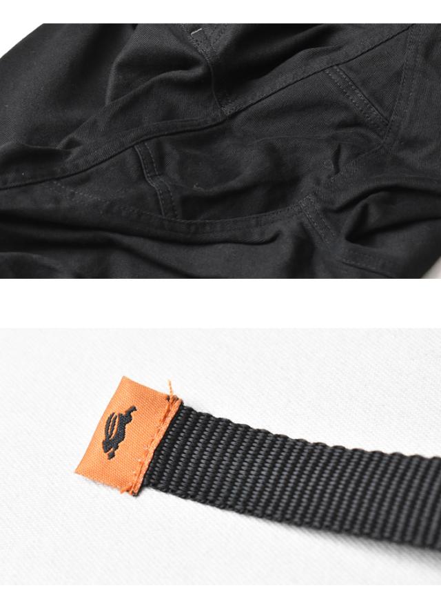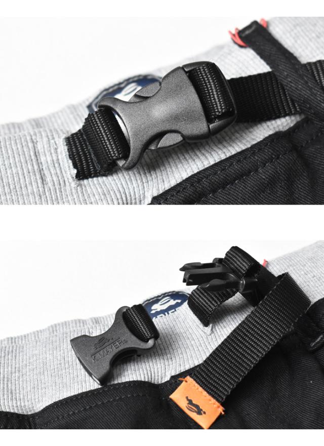 ウエストと裾をリブにアレンジ♪ クライミングパンツの代名詞でもあるウェビングベルトを装備。股部分はガゼットクロッチになっています。