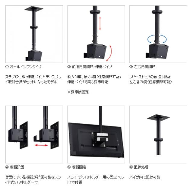 オールインワンタイプの天吊金具 ■質量:約4kg ■総耐荷重:20kg (※取付ディスプレイ:15kg以下) ■外形寸法:幅 180 × 奥行き 180 (mm) ■付属品:ディスプレイ取付ネジ、化粧カバー、固定ベルト1本、結束バンド3本 ■備考: 取付ピッチ 75×75mm 100×100mm 上下調節:50mmピッチ 8段階 角度調節:前方20度、後方4度、左右各70度(任意調節可能) スラブ面からテレビ画面センターまで、600 / 650 / 700 / 750 / 800 / 850 / 900 / 950mmの上下調節可能 化粧カバーはスラブ面から天井面まで最大390mmまで対応 ※取付けに際しての注意事項 スラブの剛性を十分に考慮の上、取付け位置を決めてください スラブへの取付用ネジは同梱されていません スラブへの取付けは取付工事専門業者にご依頼ください ※テレビ背面形状や端子位置によって、一部取付けできない機種があります。 ※取り付けるテレビの対応状況をWebサイト「テレビ取付対応検索」にて事前にご確認ください。 ※記載は商品仕様の一部です。仕様説明不足等の理由での返品はできません。特に適合等は必ずご確認ください。