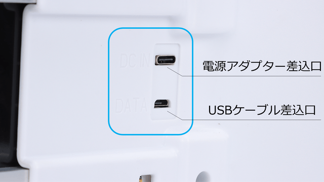 DC IN(電源アダプター差込口)に付属の電源ケーブルのType-Cプラグ側を取り付けてから、電源ケーブルのアダプター側をコンセントに差します。