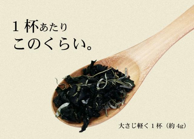 大さじ軽く一杯(約4g)を入れ、熱湯を注いで下さい。美味しいわかめスープの出来上がりです。とき玉子と合わせ雑炊にも出来ます。