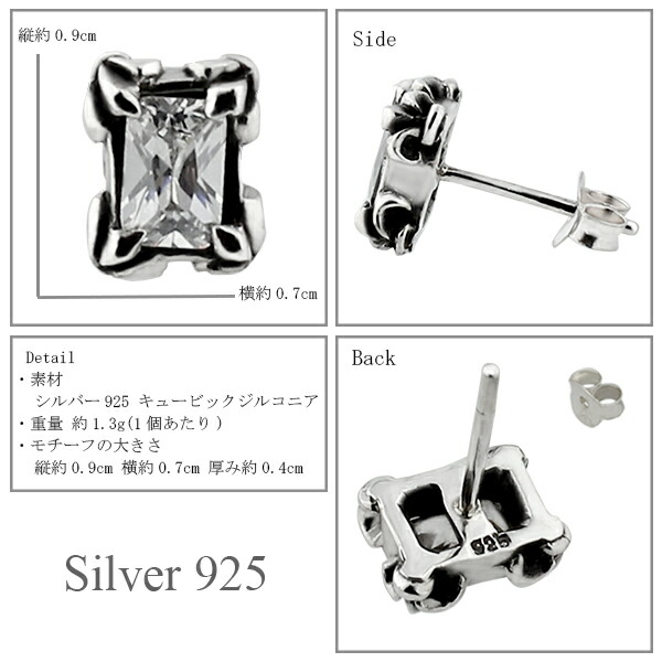 長方形にカットされたキュービックジルコニアが留められたスタッズタイプのシルバーピアスです。ジルコニアは四隅のユリの紋章で留められ、ハードテイストのアイテムになっています。
