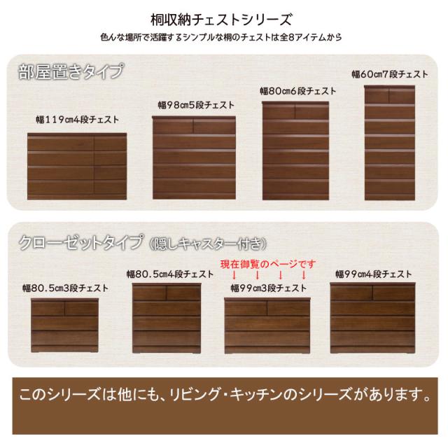 ■商品について/前面には天然木桐材をふんだんに使用し、斜めにカットされたデザイン性も魅力。桐の優しい木目感とブラウンカラーが重厚な印象。クローゼット下や押入れのデッドスペースの有効活用に大変便利なキャスター付きチェスト。大引出しにはレールが取り付けられており、タップリ収納した引出しの開閉も楽々。本体はキャスター付きだから、移動も楽々です。キャスターは外しても使用可能です。