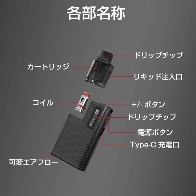 また、510規格のドリップチップに交換することでPloom Tech + ( プルームテック プラス )や Ploom Tech+ with ( プルームテックプラス ウィズ )で使用されているたばこカプセルも使用することができ、コンパクトなカードPODタイプとは思えないほどの超ハイスペックで大変オススメのモデルとなっております。