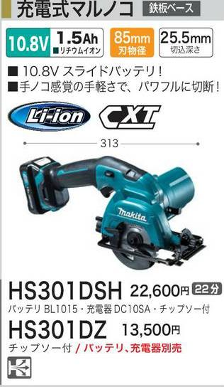 | [税込新品]マキタ 10.8V充電式マルノコHS301DSH バッテリ・充電器・チップソ付 丸鋸/丸ノコ/マルノコ | |