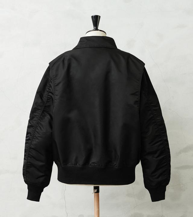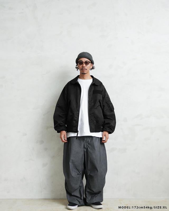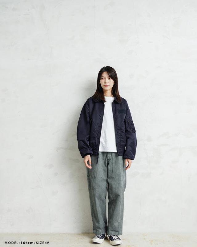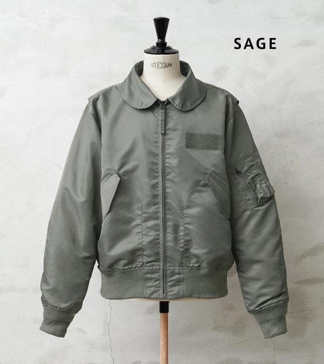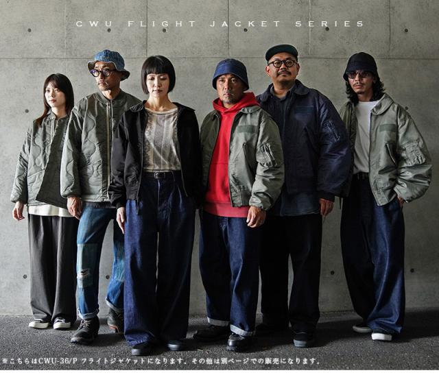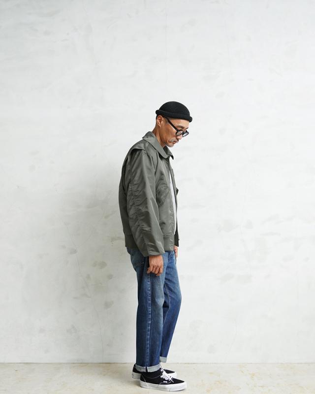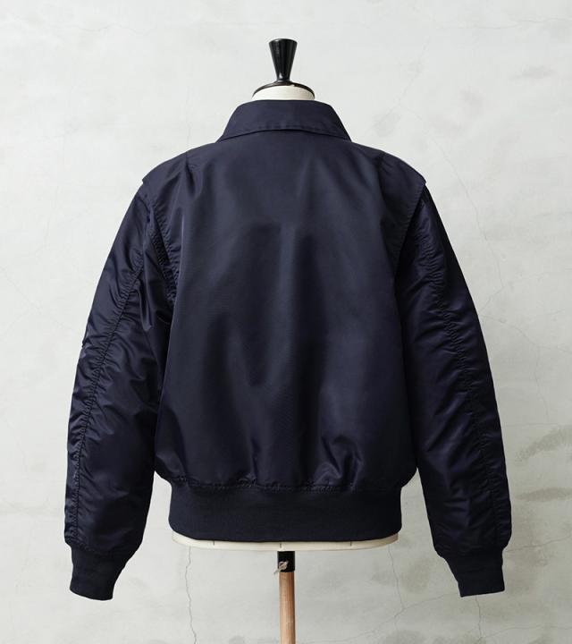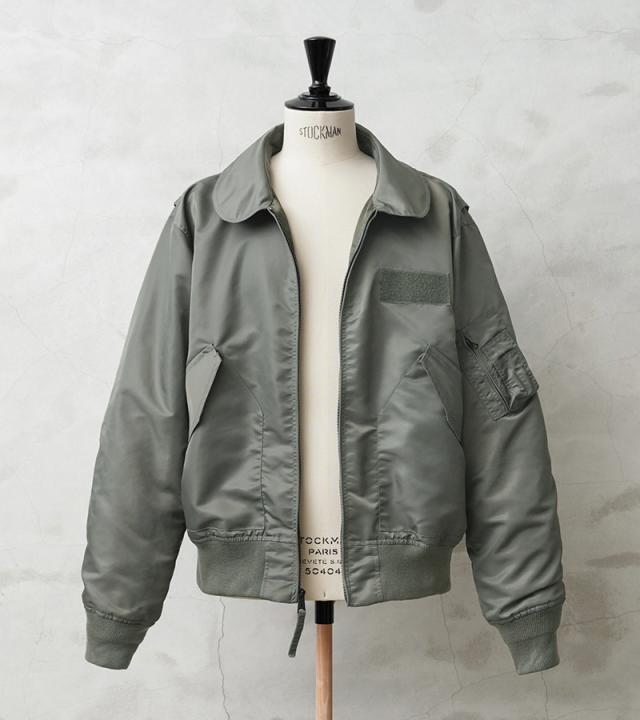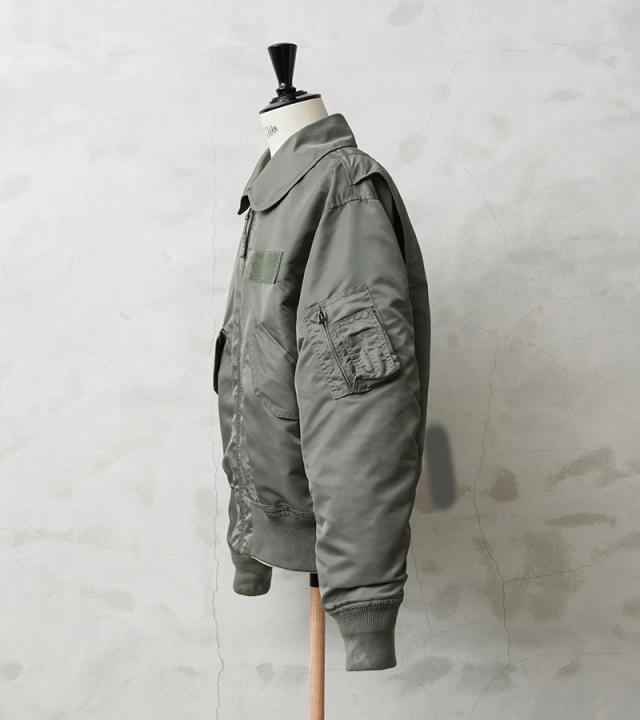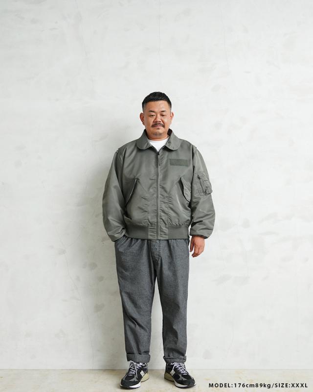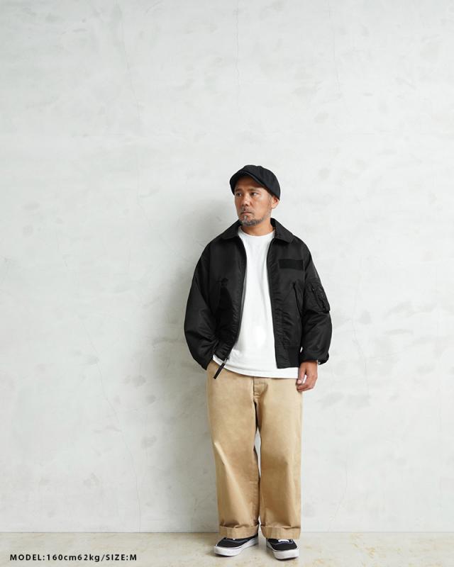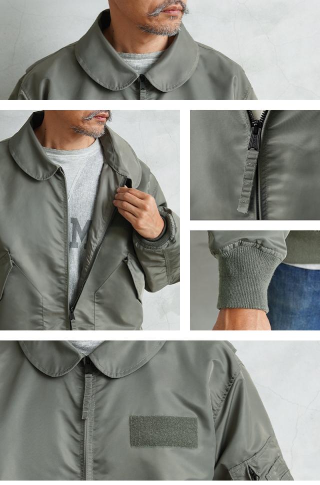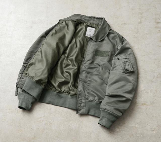 特徴的なディテールとして、CWUのポイントである背中のアクションプリーツ。さらに中綿がない薄手のシルエットは秋口から気軽に羽織れるフライトジャケットとしてL-2同様に探している人も多い人気の型となります。