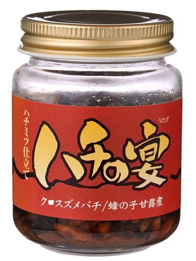 | ハチの宴はハチミツ・しょうゆのみの調味方法で砂糖他、化学調味料・添加物を一切使っておりません。天然クロスズメ蜂の3段階の蜂の子ブレンド!成長段階の異なる蜂の子をブレンドすることによって絶妙な食感にこだわりました。 |