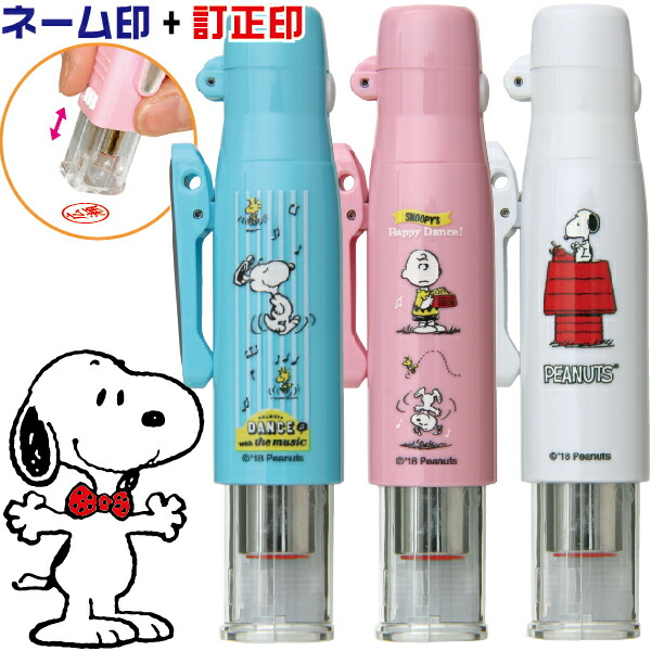 世界中で大人気のスヌーピーがプリントされた、ネーム印も訂正印もキャップレスの、とってもかわいいツインネーム印です。